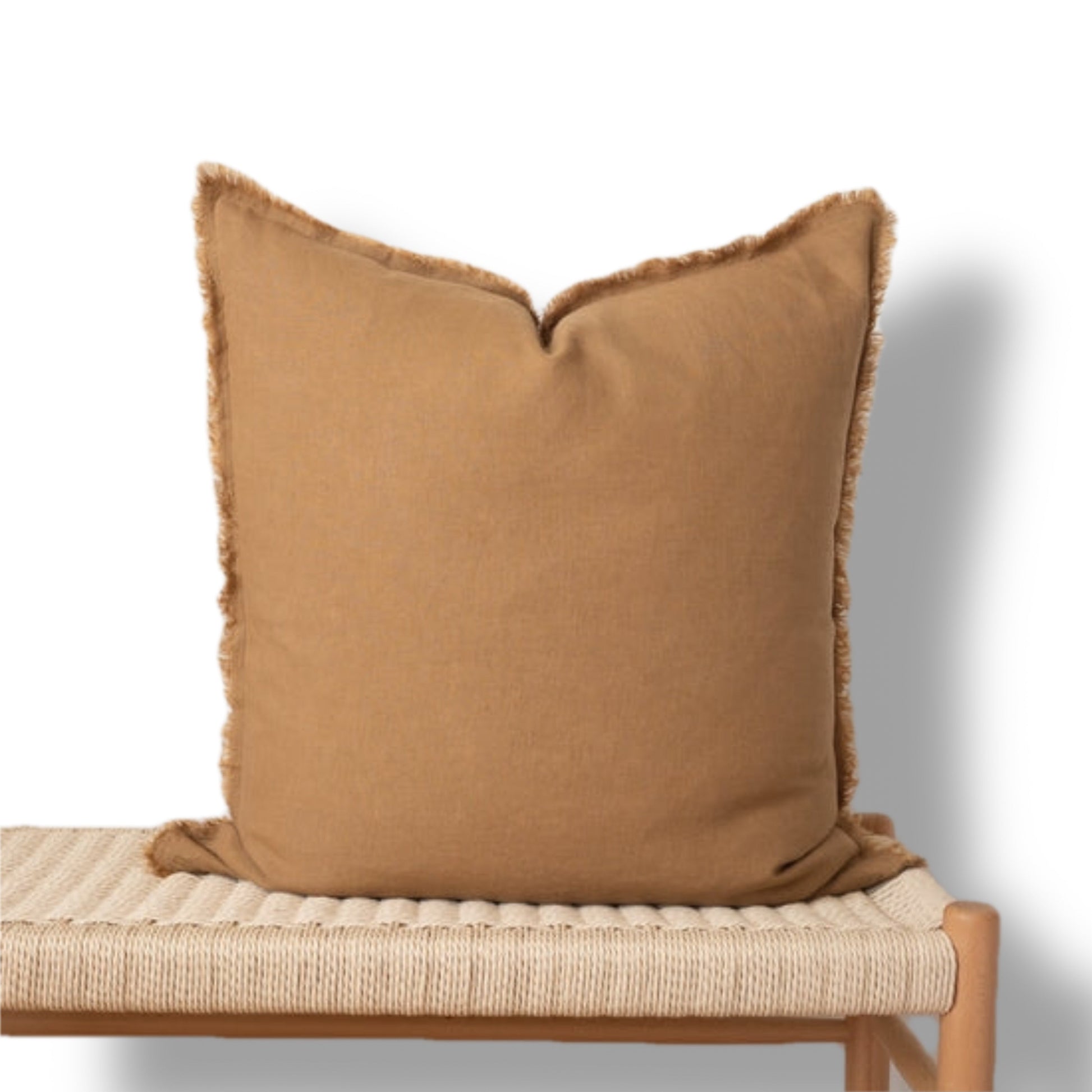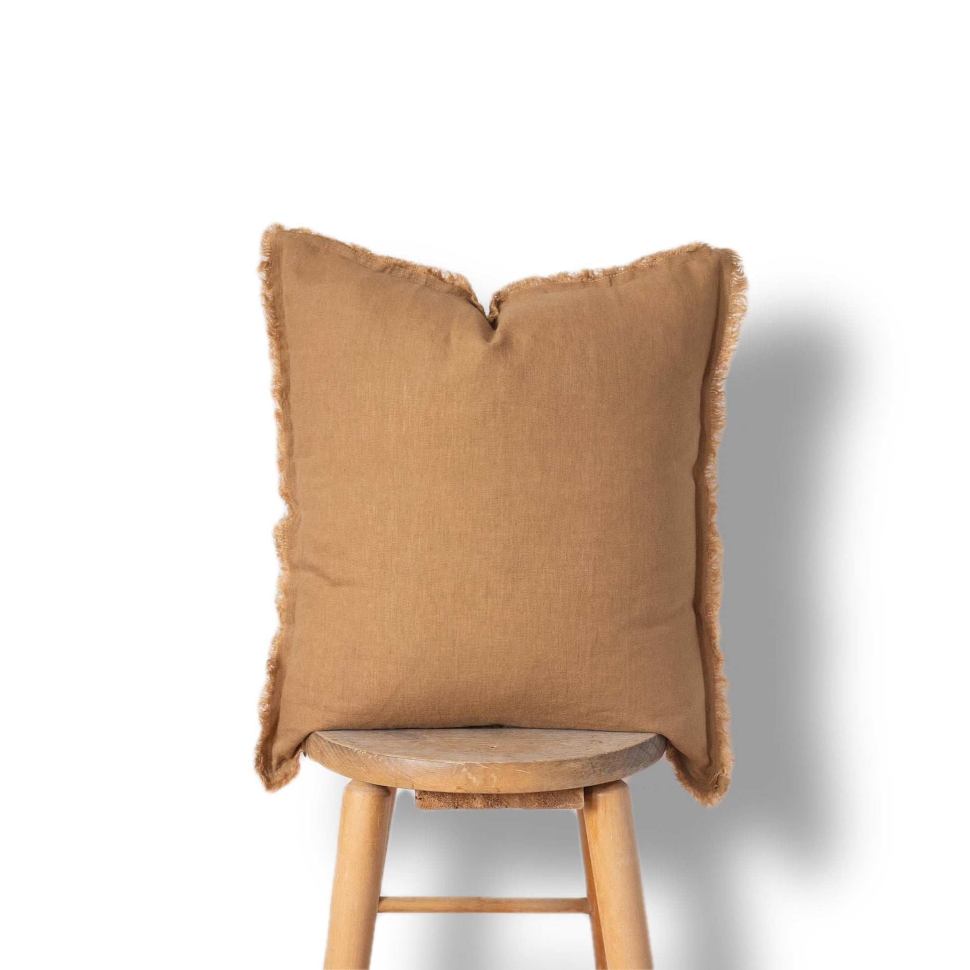 This 100% linen Square Fringed Pillow Cover in Camel is made from the finest French and Belgian flax. This cover is made in Portugal and stonewashed for a soft feel from day one. Edged with black piping.
